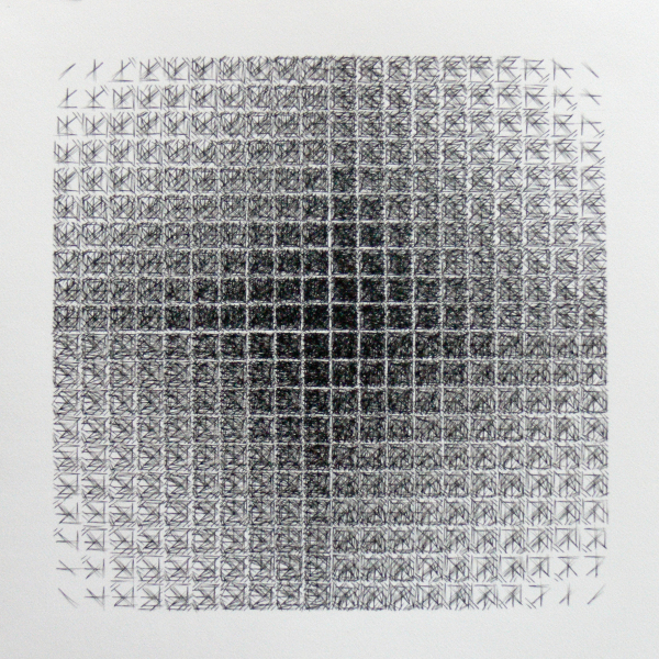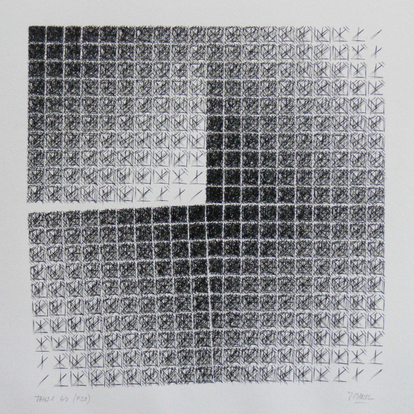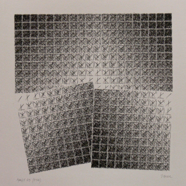 Avril 2020: Le module est composé de 100 cases. Comme pour les premiers essais chaque dessin comporte 4 modules. J'expérimente intuitivement différentes possibilités pour me rendre rapidement compte qu'une règle s'impose. Un ami me donne la solution: Il y a 256 possibilités. Pour chacune je réalise un montage numérique, puis j'assemble les résultats obtenus par quatre, par seize (1-16, 17-32, 33-48....241-256) par 64 et enfin j'obtiens le montage final, 16x16 modules.